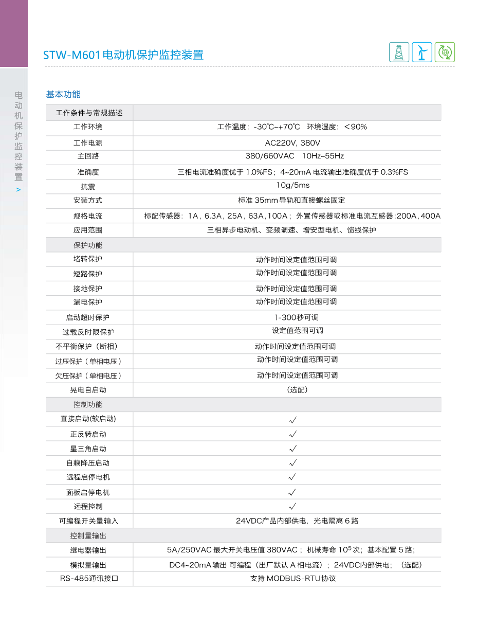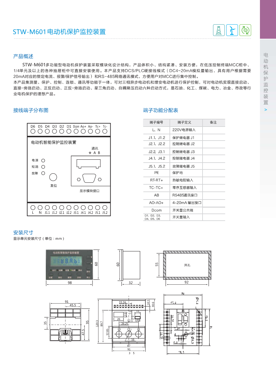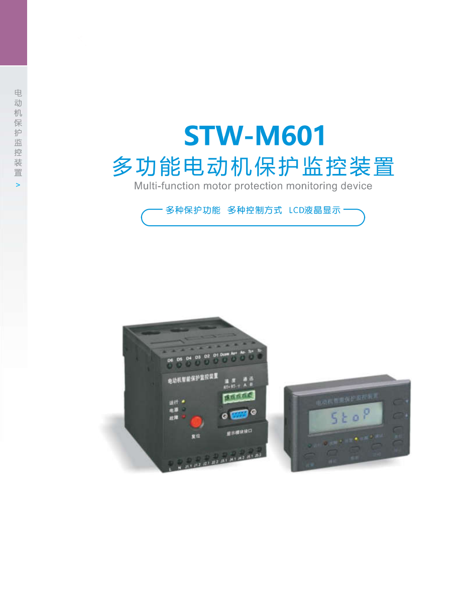 STW-M601多功能型電動機保護裝置采取模塊化設計結構,產品體積小,結構緊湊、安裝方便,在低壓控制終端MCC柜中、1/4單元及以上的各種抽屜柜中可直接安裝使用。本產品支持DCS/PLC硬接線模式( DC4-20mA模擬量輸出,具有用戶根據需要20mA對應的整定電流、報警保護值號輸出)和RS-485網絡通訊模式,方便用戶對MCC進行集中控制。
