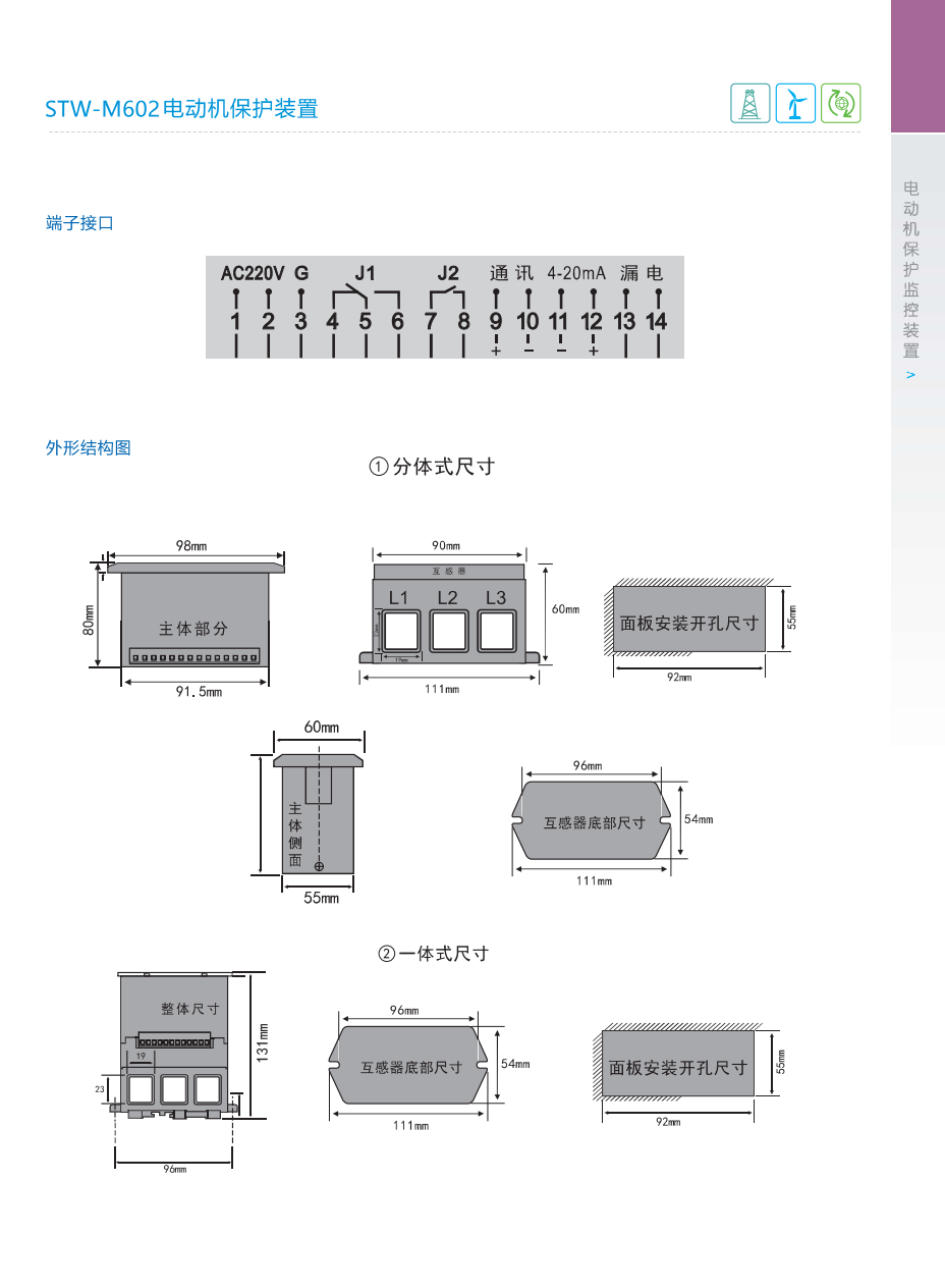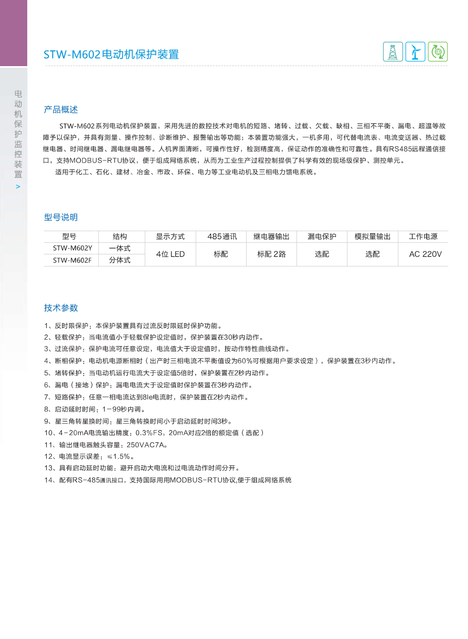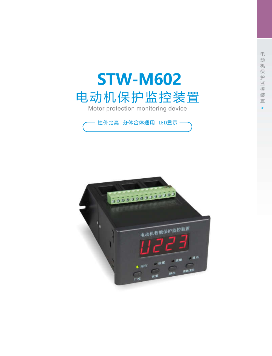 STW-M602系列電動機保護裝置,采用先進的數控技術對電機的短路、堵轉、過載、欠載、缺相、三相不平衡、漏電、超溫等故障予以保護,并具有測量、操作控制、診斷維護。報警輸出等功能;本裝置功能強大,一機多用,可代替電流表、電流變送器、熱過載繼電器、時間繼電器、漏電繼電器等。人機界面清斷。可操作性好,檢測精度高,保證動作的準確性和可靠性。具有RS485運程通信接口,支持MODBUS-RTU協議,便于組成網絡系統,從而為工業生產過程控制提供了科學有效的現場級保護、測控單元。