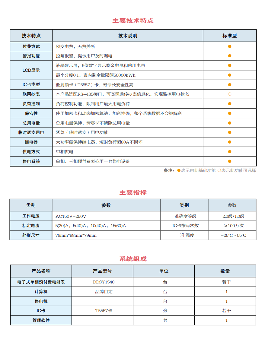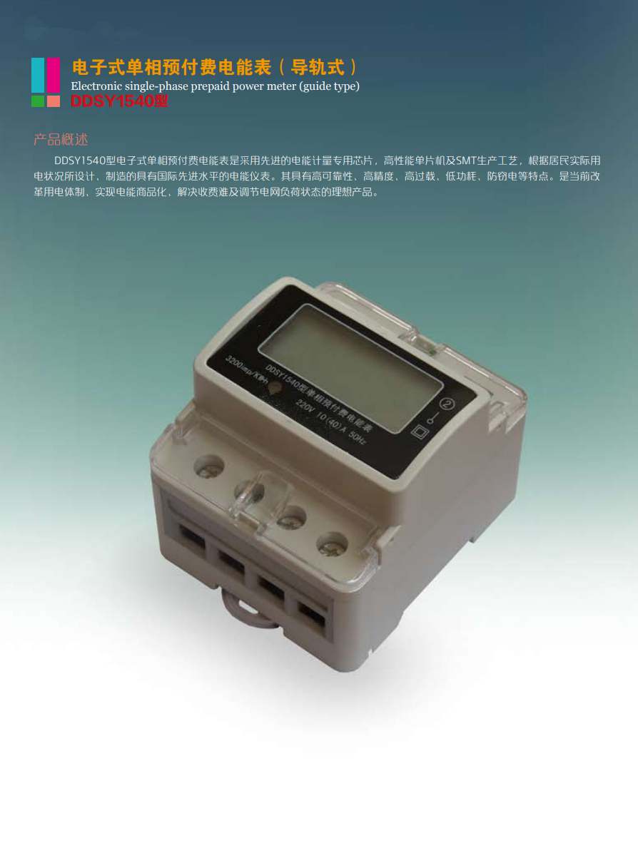 DDSY1540型電子式單相預付費電能表是采用先進的電能計量專用芯片,高性能單片機及SMT生產工藝,根據居民實際用電狀況所設計、制造的具有國際先進水平的電能儀表。其具有高可靠性、高精度、高過載、低功耗、防竊電等特點。是當前改革用電體制、實現電能商品化、解決收費難及調節電網負荷狀態的理想產品。
