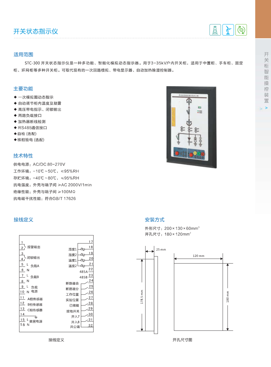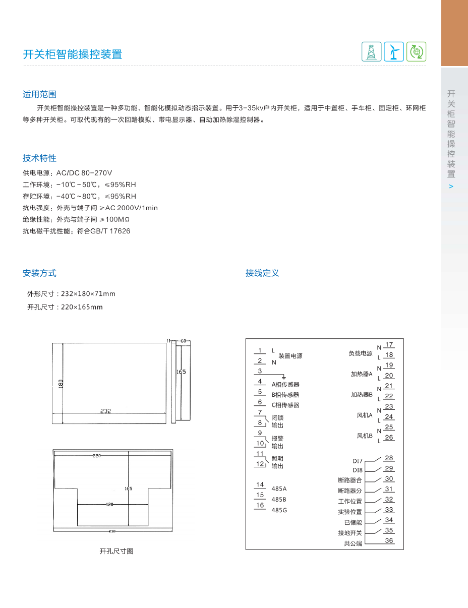 開關柜智能操控裝置是一種多功能、智能化模擬動態指示裝置。用于3-35kv戶內開關柜,適用于中置柜、手車柜、固定柜、環網柜等多種開關柜。可取代現有的一次回路模擬、帶電顯示器、自動加熱除濕控制器。