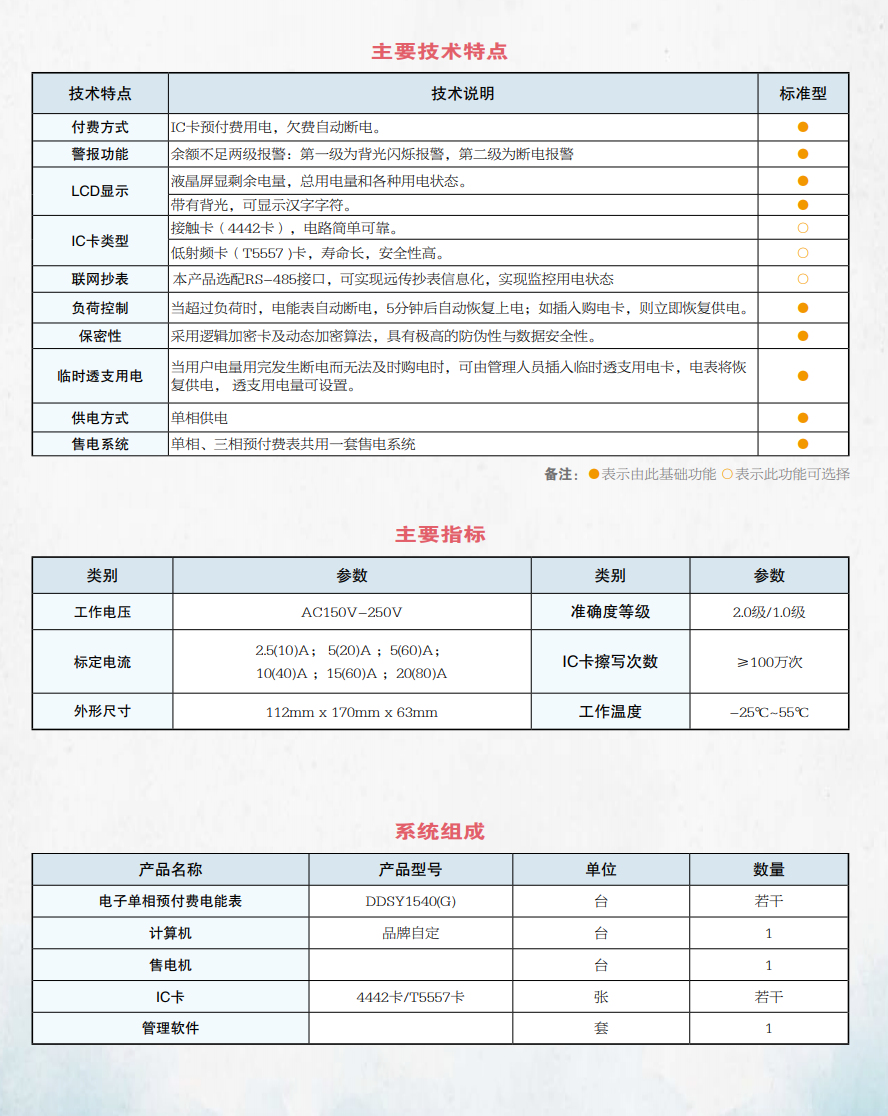 本預付費電能表采用低功耗LED液晶顯示,采用進口專用電能計量芯片和低功耗微處理器設計及先進的SMT生產工藝,產品符合GB/T17215.321-2008及GB、T18460.3-2001技術標準,具備正反向交流有功電能的計量,具有產品計量標準穩定、安全可靠、性能穩定、功能豐富、操作簡單、防竊電、抗破壞、防攻擊能力強、工作溫度范圍寬、能長期穩定可靠工作等優點。適用于小區居民、公寓用戶、樓宇辦公、企事業單位等用電場所的計量與控制。