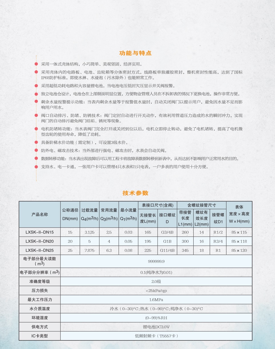 本產品為電子式預付費智能水表,主要用于計量流經管道的水體總量,先付費后用水,方便用水管理,可以帶M-BUS通訊接口,實現多戶水表集中刷卡或者遠程自動抄表。