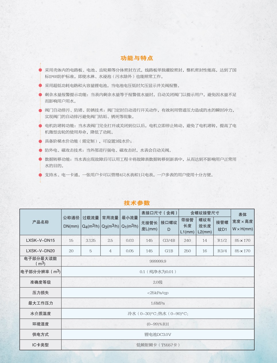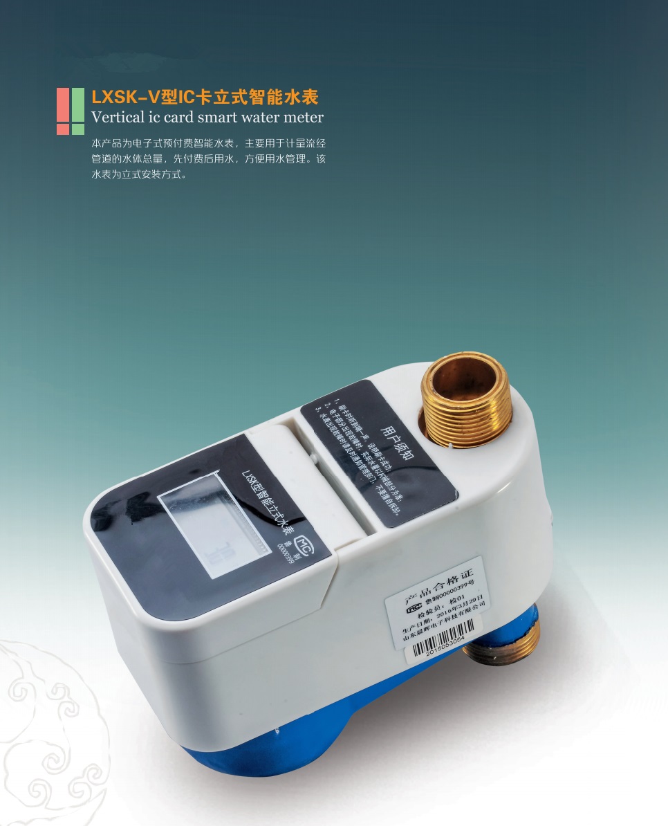 本產品為電子式預付費智能水表,主要用于計量流經營管的水體總量,先付費后用水,方便用水管理。該水表為立式安裝方式。