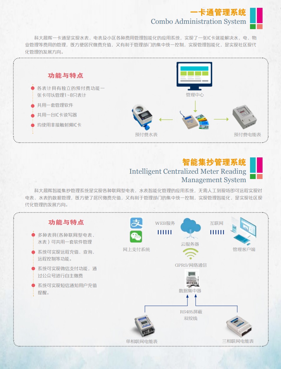 科大晨暉一卡通是實現水表、電表、熱量表及小區各種費用管理智能化的應用系統,實現了一張IC卡就能解決水、電、熱、物業管理等費用的管理,既方便居民繳費充值,又有利于管理部門的集中統一控制,實現管理智能化,是實現嗎社區現代化管理的發展方向。