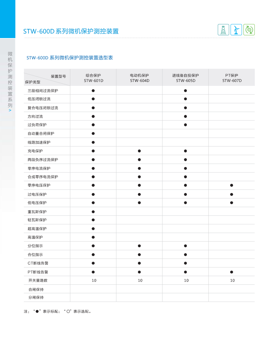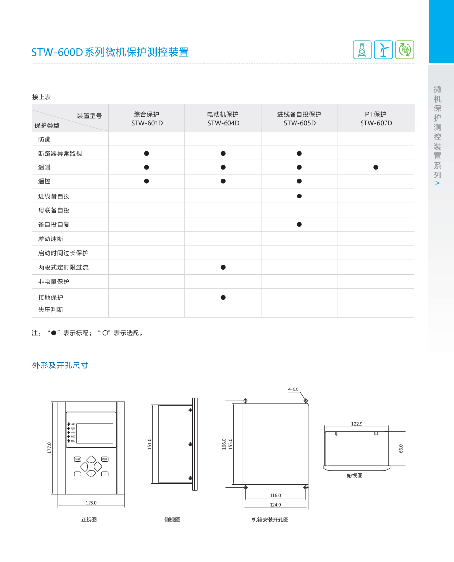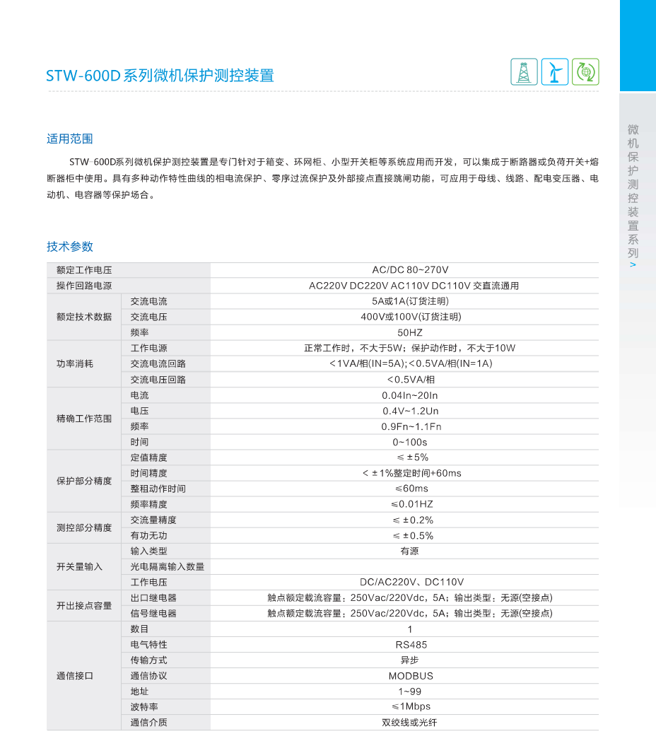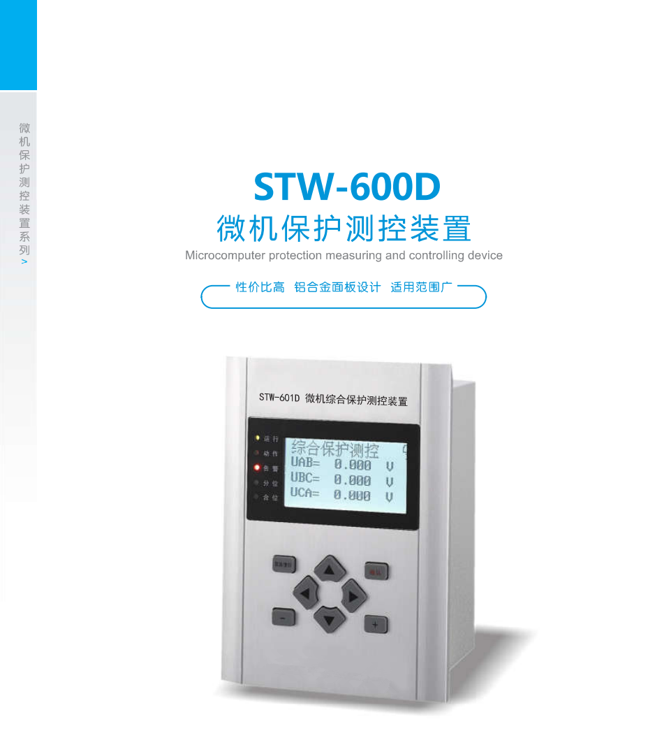 STW-600D系列微機保護測控裝置是專門針對于箱變、環網柜、小型開關柜等系統應用而開發,可以集成于斷路器或負荷開關+熔斷器柜中使用。具有多種動作特性曲線的相電流保護、零序過流保護及外部接點直接跳閘功能,可應用于母線、線路、配電變壓器、電動機、電容器等保護場合。