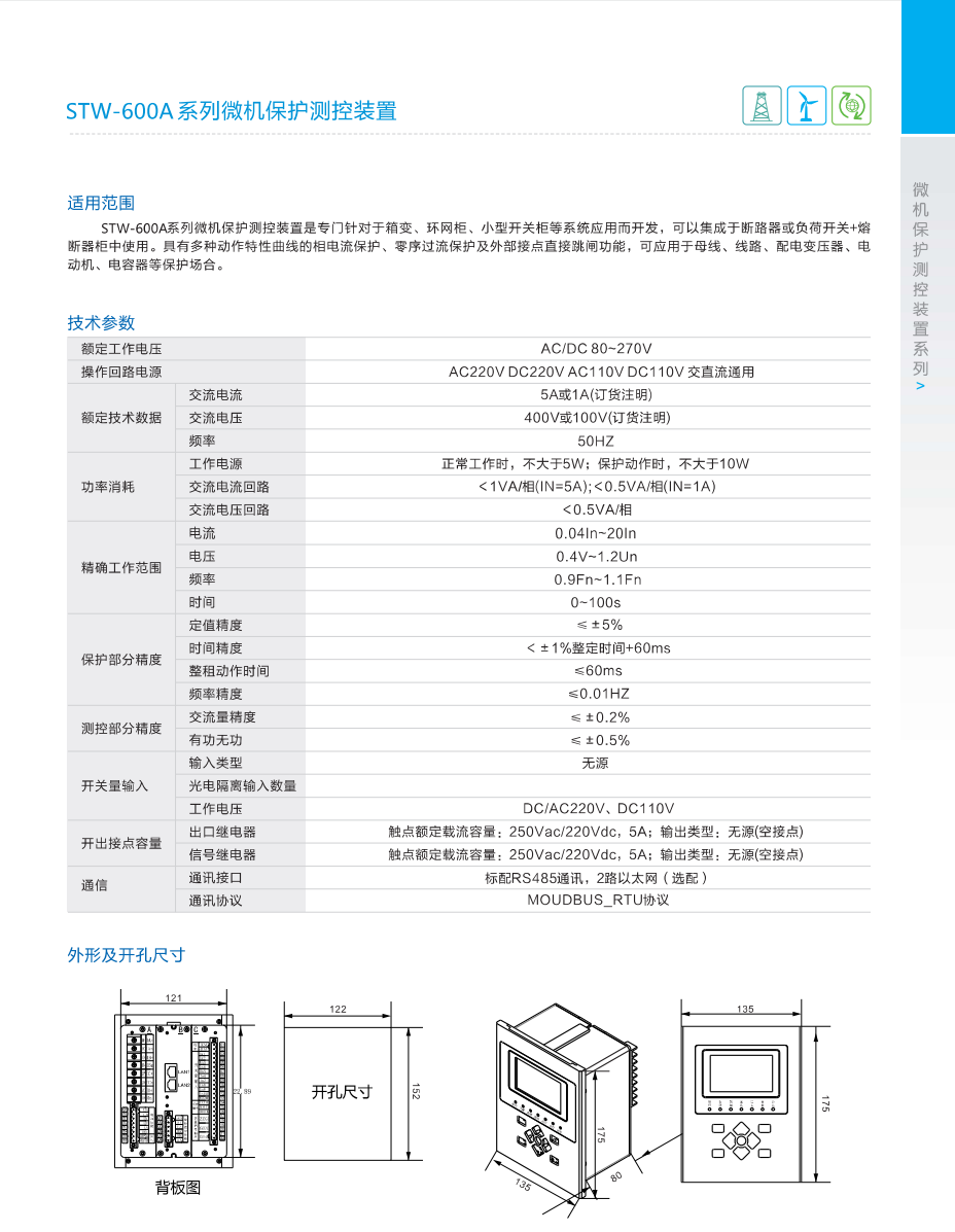 STW-600A系列微機保護測控裝置是專門針對于箱變、環網柜、小型開關柜等系統應用而開發,可以集成于斷路器或負荷開關+熔斷器柜中使用。具有多種動作特性曲線的相電流保護、零序過流保護及外部接點直接跳閘功能,可應用于母線、線路、配電變壓器、電動機、電容器等保護場合。