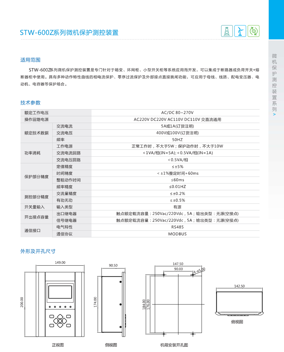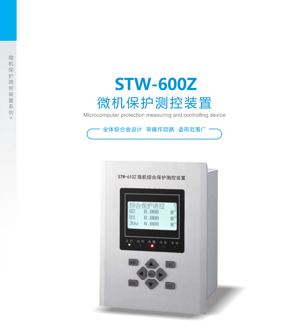 STW-600Z系列微機保護測控裝置是專門針對于箱變、環網柜、小型開關柜等系統應用而開發,可以集成于斷路器或負荷開關+熔斷器柜中使用。具有多種動作特性曲線的相電流保護、零序過流保護及外部接點直接跳閘功能,可應用于母線、線路、配電變壓器、電動機、電容器等保護場合。