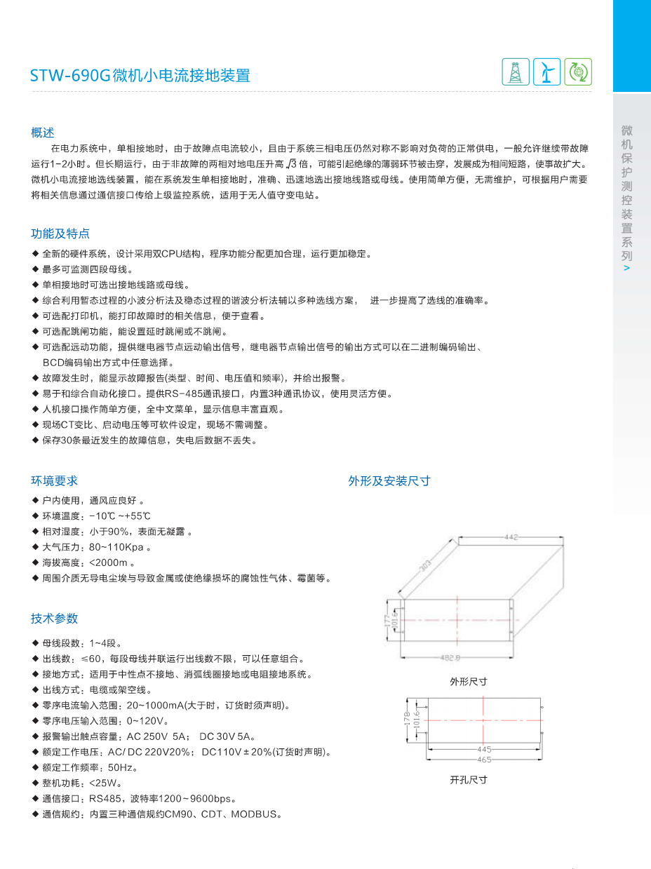 在電力系統中,單相接地時,由于故障點電流較小,且由于系統三相電壓仍然對稱不影響對負荷的正常供電,一般允許繼續帶故障運行1-2小時。但長期運行,由于非故障的兩相對地電壓升高√3倍,可能引起絕緣的薄弱環節被擊穿,發展成為相間短路,使事故護大。微機小電流接地選線裝置,能在系統發生單相接地時,準確、迅速地選出接地線路或母線。使用簡單方便,無需維護,可根據用戶需要將相關信息通過通信接口傳給上級監控系統,適用于無人值守變電站。
