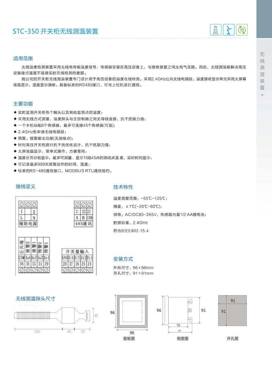 我公司的開關柜無線測溫裝置專門設計用于高壓設備的溫度在線檢測。采用2 4GHz公共無線電頻段。溫度接收顯示單元采用大屏幕液晶顯示,溫度顯示清晰。具備標準的RS485接口,可與上位機進行通信。