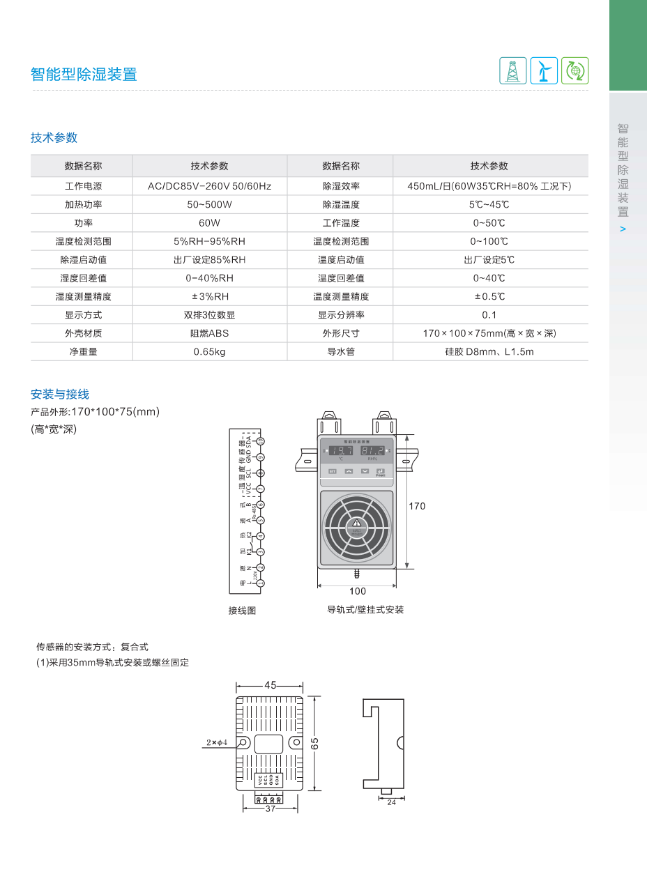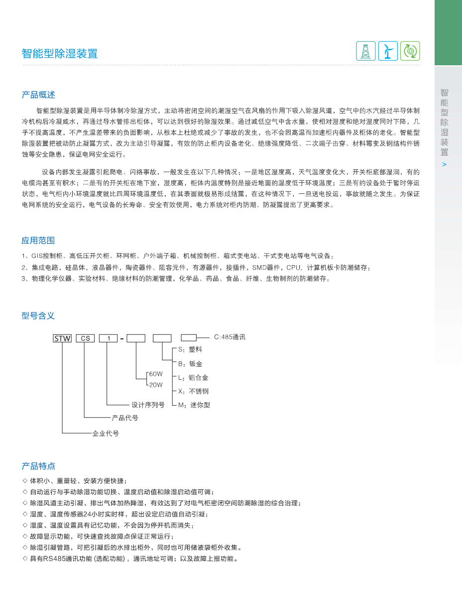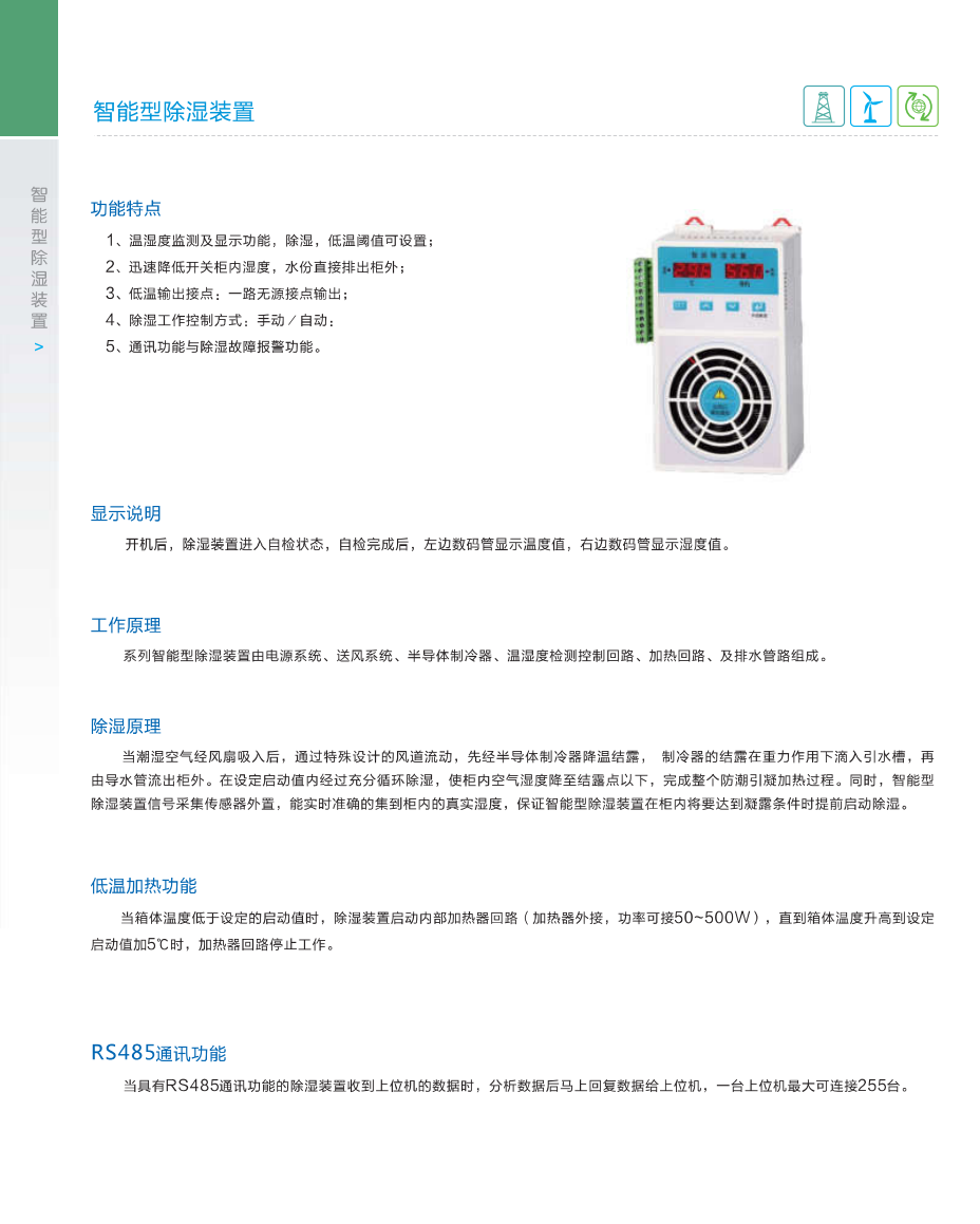 智能型除溫裝置是用半導體制冷除濕方式,主動將密閉空間的潮濕空氣在風扇的作用下吸入除溫風道,空氣中的水汽經過半導體制冷機構后冷凝威水,再通過導水管排出柜體,可以達到很好的除濕效果。通過減低空氣中含水量,使相對濕度和絕對濕度同時下降,幾乎不提高溫度,不產生溫差帶來的負面影響,從根本上杜絕或減少了事故的發生,也不會因高溫而加速柜內器件及柜體的老化。智能型除濕裝置把被動防止凝露方式,改為主動引導凝露,有效的防止柜內設備考化、絕緣強度降低、二次端子擊穿、材科霉變及鋼結構件銹蝕等安全隱患,保證電網安全運行。
